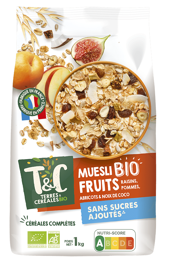 Le muesli aux fruits est composé de flocons de céréales complètes associés à des